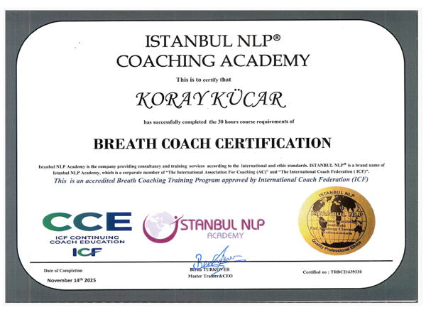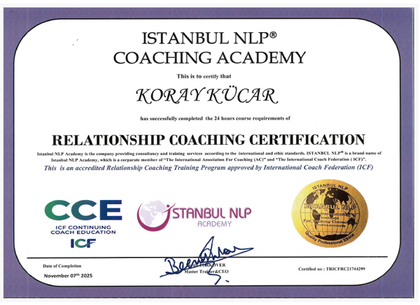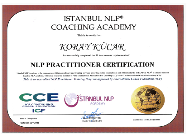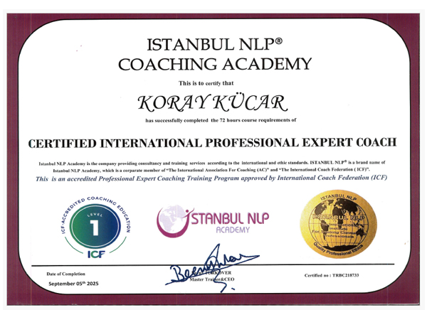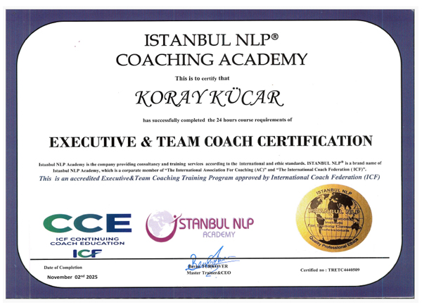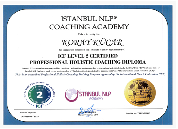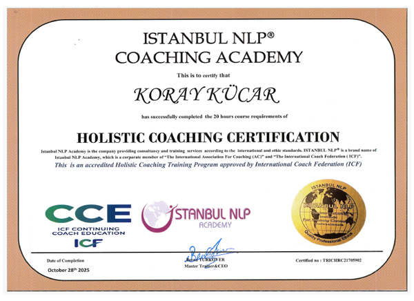 Koçluk çalışmalarımda kullandığım yaklaşım ve yöntemler, alanında yetkin kurumlar tarafından verilen eğitimler ve sertifikalarla desteklenmektedir.